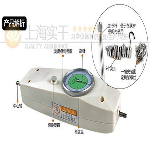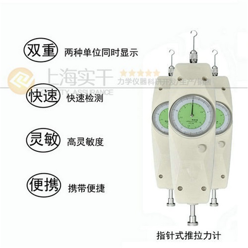 上海实干测力计是小型便捷式的拉力和压力测试仪器,该弹簧测力计具有高精度、易操作、可同时显示牛顿和公斤单位捷带方便之优点。此款弹簧测力计广泛应用于电子、高低压电器、五制锁、汽车配件、粘胶化工、打火机及点火装置、制笔、轻工、建筑、纺织、机械等行业和科研机构作拉压负荷、插拔力、破坏性试验测试等,是老式测力计的替代产品。